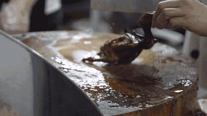 等待客人下单,厨师到鸽房中取出可以制作的鸽子,再迅速回到厨房调配油炉温度,待油温合适时,每次放入一只乳鸽于热油中浸炸九十秒,随后起锅,放于砧板之上,将乳鸽斩为四件。