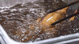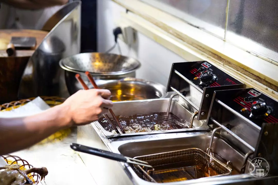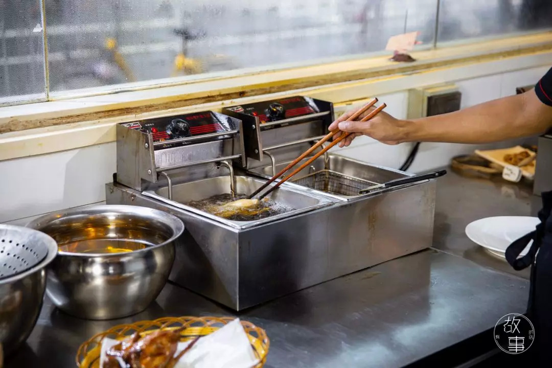 然后等待饭市期间客人下单之后,再从鸽房取出需要制作的数量,送至厨房进行浸炸。厨师必须严格把控浸炸的油温及时间,不得太过,否则将会直接影响乳鸽的口感。