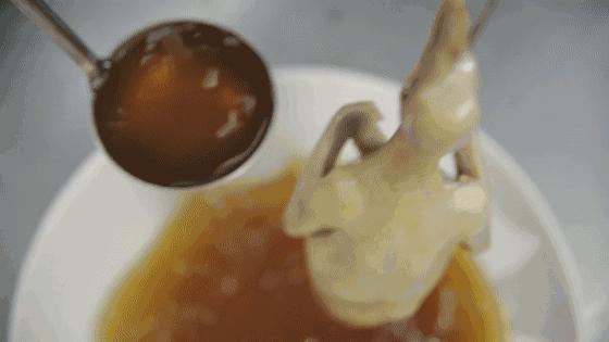 麦芽糖兑水,熬制成糖浆。以铁钩穿刺于鸽子的脖子位置,将其吊于麦芽糖浆之上,然后勺起糖浆,自乳鸽头部开始往下浇淋。为鸽子上色期间需不时转动鸽身,以确保每个部位皆上色均匀。
