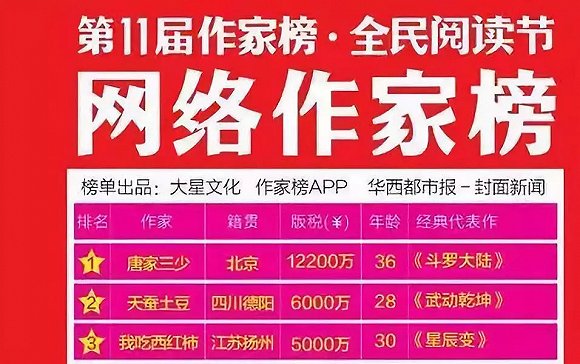 许多人都知道网文作家唐家三少,去年的第11届网络作家榜上,唐家三少以1.22亿登顶,连续五年称霸网络作家榜。
