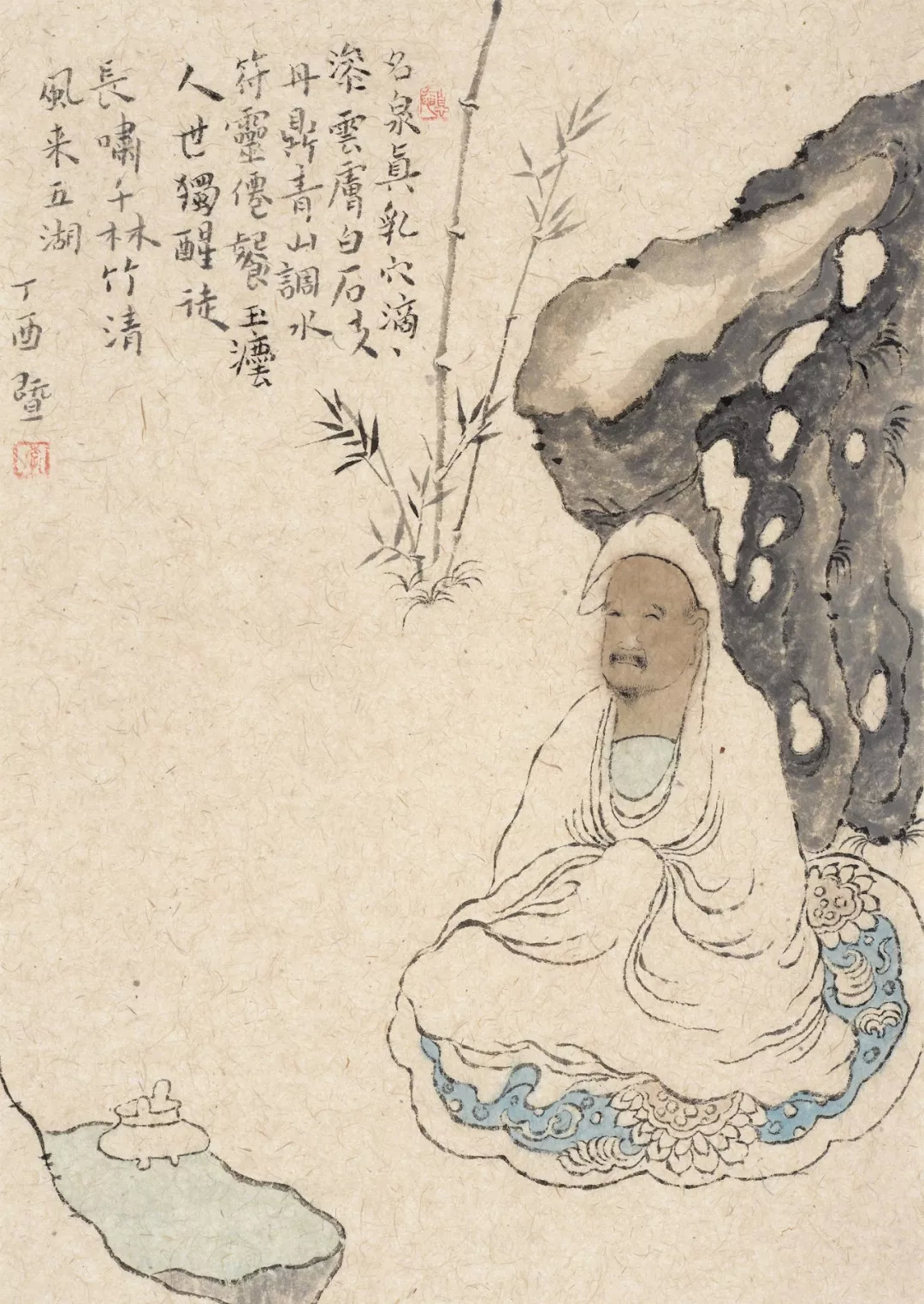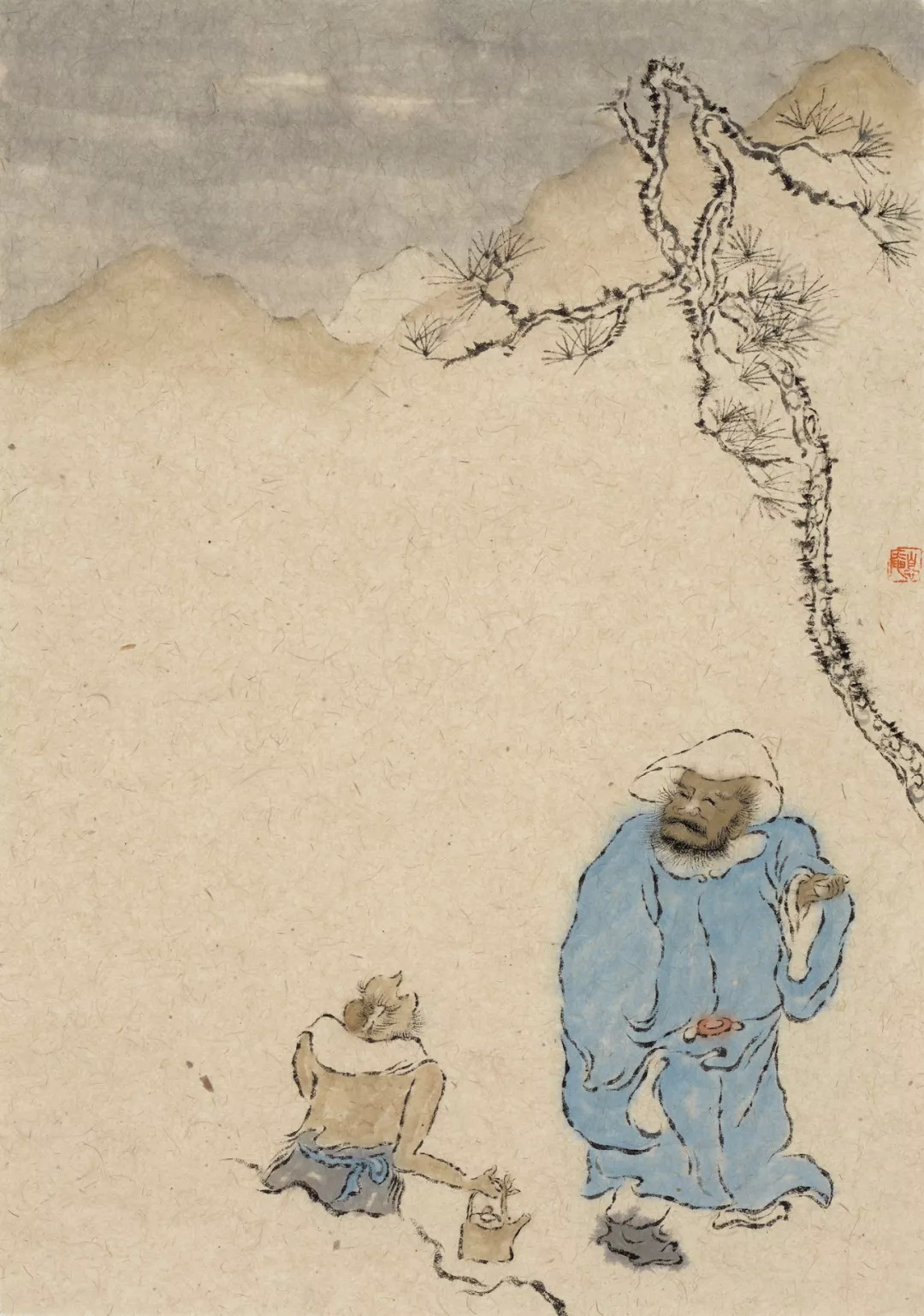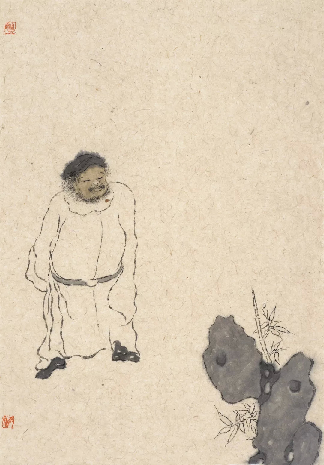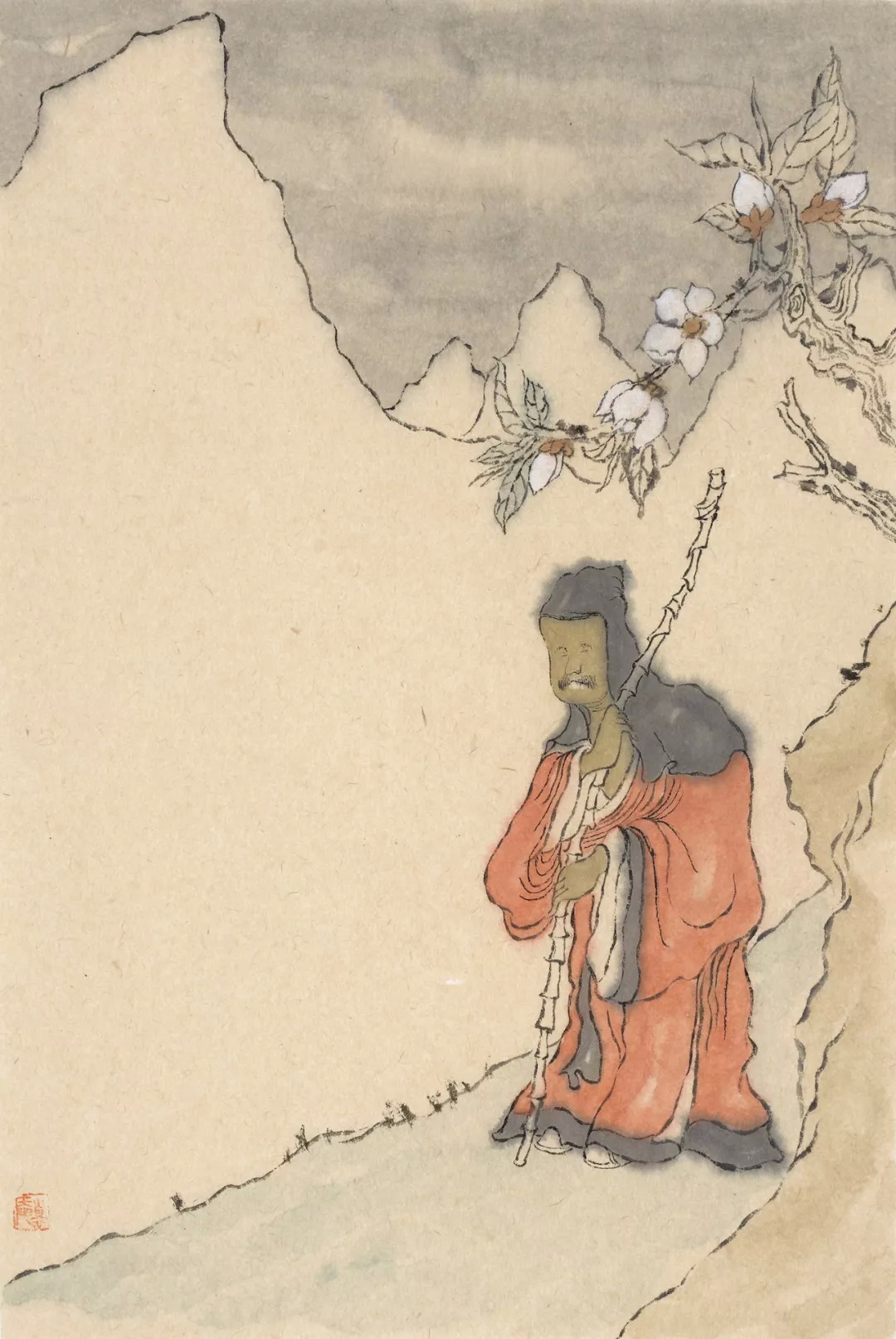 師兄自幼喜畫,不輟研窮,矻矻求索。不離古風,心靜如水,其畫風漸入禪畫之門。溯源子嗡學藝之履,當有所感。其初謁法眼寺明一法師,後依止元學禪院伍燈法師門下,畫事受業於一舨先生,依怙明師,獲殊勝力。若非前世修來,豈能有諸多明師加持?兄之畫有圓融之境。以禪入畫,以墨蘊詩,風格古俊,高標不群。筆法遲澀,而步步生風。布局迥異,而不離世間覺。《金剛經》云:“凡所有相,皆是虛妄,若見諸相非相,即見如來。”子嗡兄的羅漢造像,變化多端,不拘一格,功力自見。