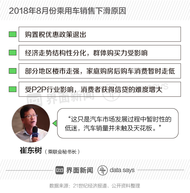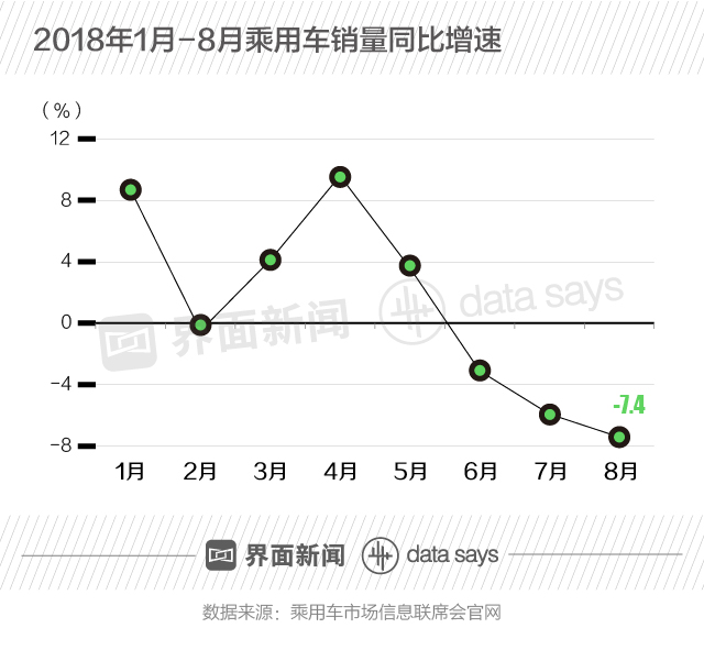 从销售量同比增速来看,2018年1月至8月,乘用车销量共计出现3次同比负增长。其中,8月份同比下降7.4%。