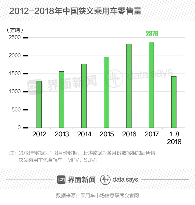 从近年乘用车零售量来看,狭义乘用车(包含轿车、MPV和SUV)在2016年首次超过2000万辆,并在2017年“稳”在2378万辆。