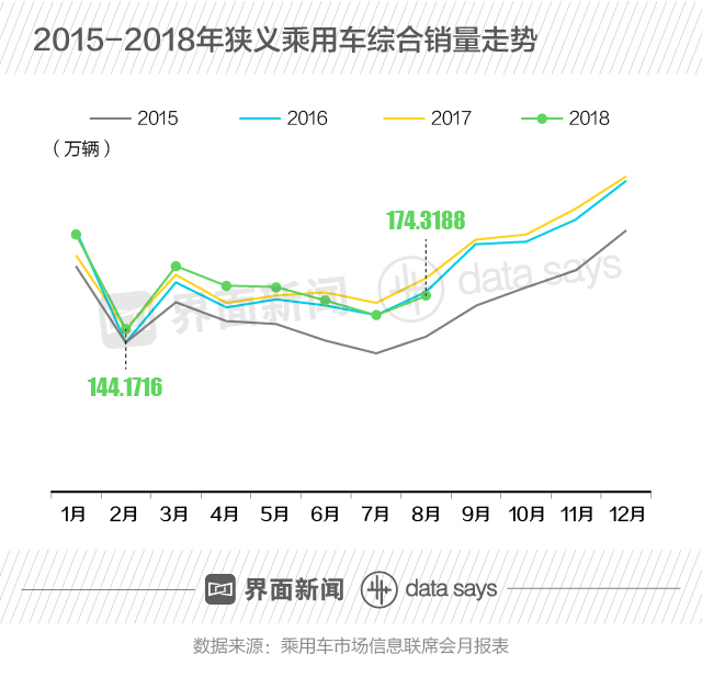就2018年月度数据来看,狭义乘用车销量在3月份达到小峰值197.9714万辆后,开始逐月走低。8月份,狭义乘用车综合销量共计174.3188万辆,低于2017与2016年同期水平。