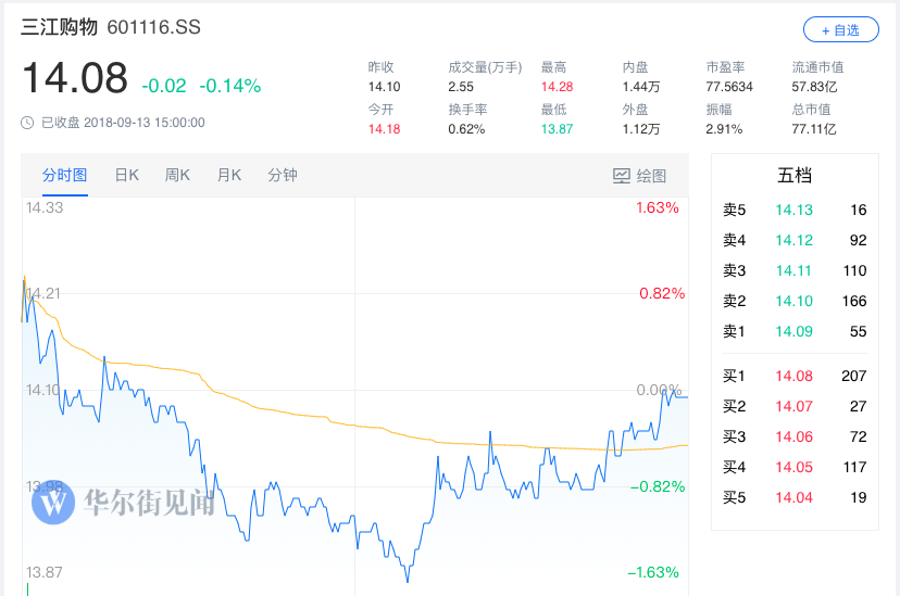 业绩的糟糕表现引发了外界对于三江新零售改造成果的质疑。在过去的几个月,三江的股价也一路下跌。从6月初每股最高21.56元,一路下探,截至9月13日全天候科技发稿前,三江以14.08元收盘,较6月高位下跌近35%。