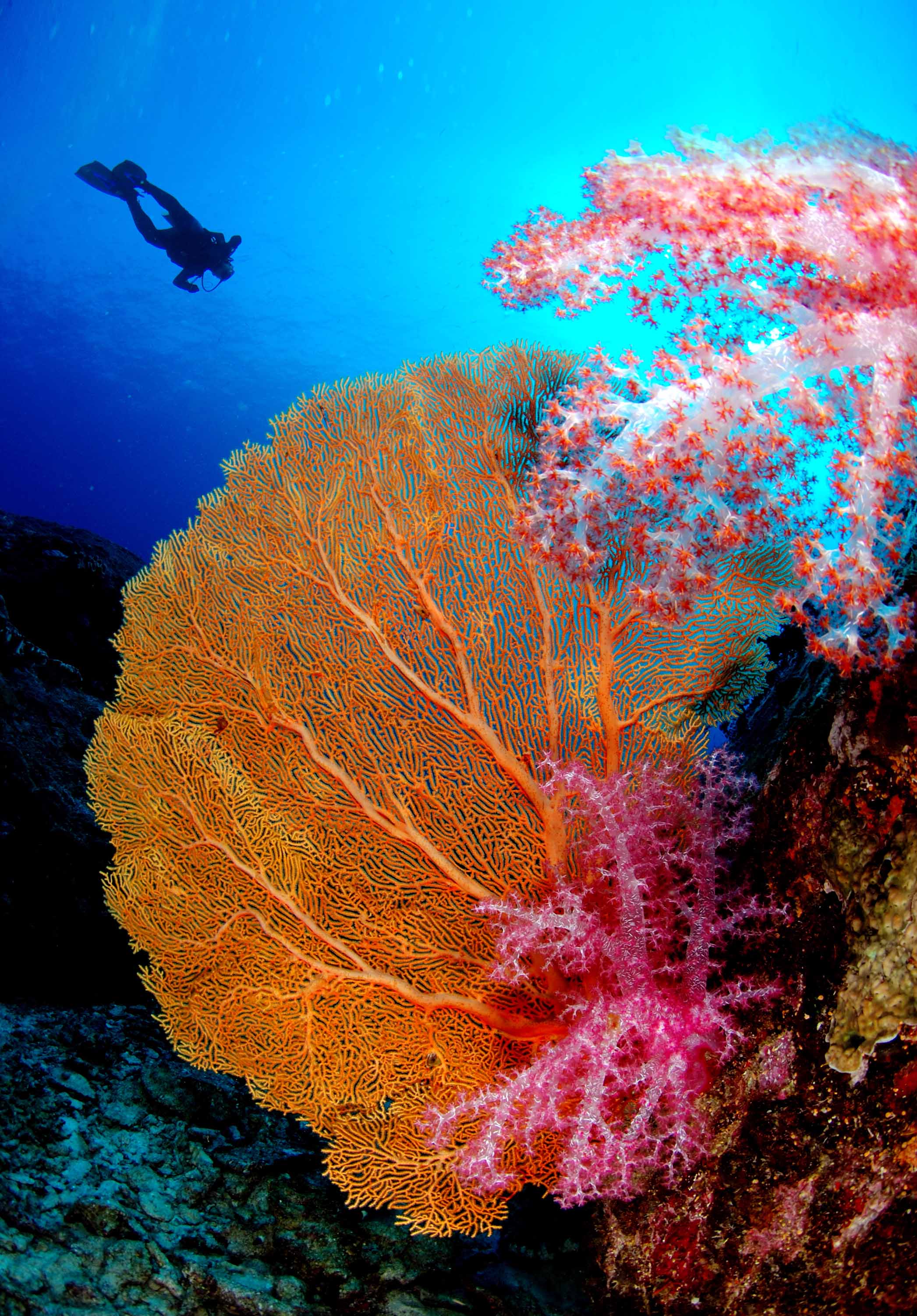 邦卡保育区内多数海岛人烟罕至,珊瑚覆盖率极高。从沙滩走进海中,只要离开船道,立刻就能见到各种各样的珊瑚向四面八方延展出去,美得教人舍不得眨眼。值得一提的是,强大的洋流让你能在此处发现中上层的鱼类以及大型的鱼群风暴。