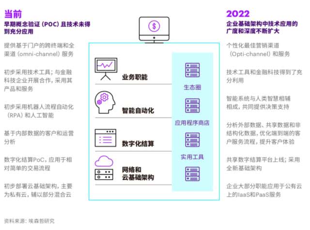 此外,根据埃森哲制定的“云100”愿景,传统技术与平台将逐渐被替代,相关服务和数据将由Microsoft、Google、Amazon和HP等技术巨擘、行业共享服务和金融科技企业共同管理和提供,公司仅保留差异化资产,包括专有平台、算法和数据。此外,企业还将管理这些资产在云端和服务供应商之间的部署、集成和信息安全。