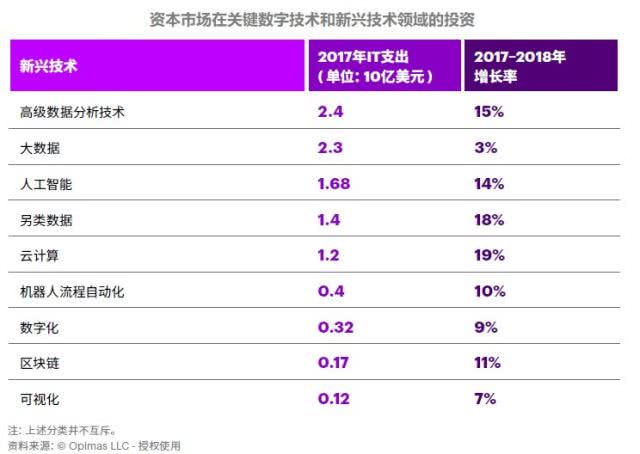 资本市场行业中的企业已不满足于单纯优化流程,而是重新基于新技术设计业务流程。他们正在采用更智能的自动化技术、爆炸式增长的数据,帮助企业分析和应用更多更复杂的业务场景。例如,从视频和图像等非结构化数据中提取相关信息以提高销售效率,侦测异常情况,以及支持更广泛的数据分析应用。许多投行和资管公司纷纷投资人工智能来协助进行投资预测分析,从而获取超额收益。