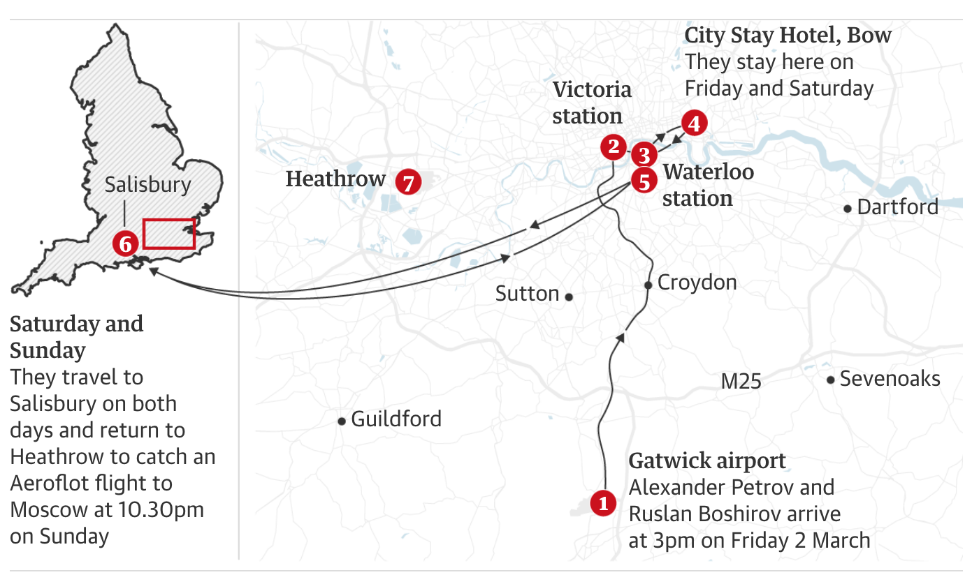 根据英国警方提供的CCTV监控录像及调查,2018年3月2日,两人乘俄罗斯航空飞机从莫斯科抵达伦敦。3月3日,两人前往下毒地点、英国南部小镇索尔兹伯里(Salisbury)进行侦查,并于当天返回了伦敦。3月4日,两人再次前往索尔兹伯里,并在俄前双面间谍谢尔盖·斯克里帕尔(Sergei Skripal)的住处附近逗留。随后,两人返回伦敦并于当晚飞回了俄罗斯。