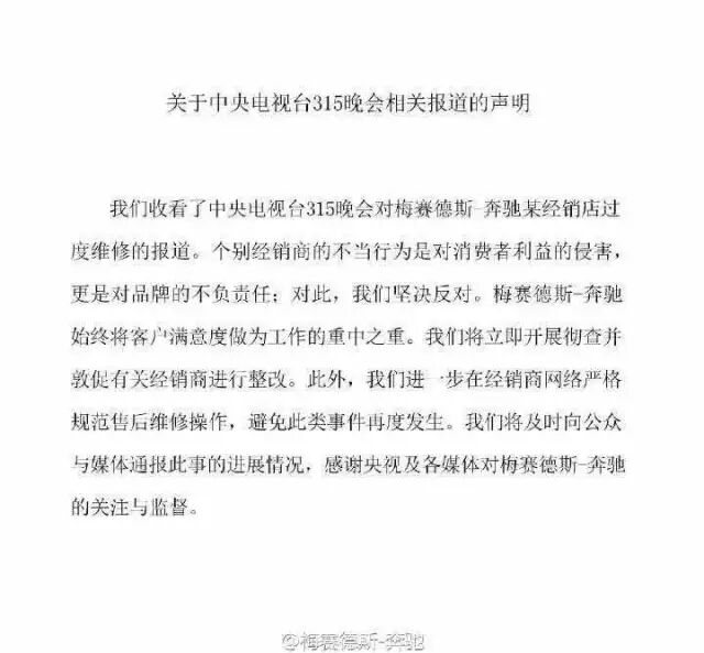 但是蓝劼指出,奔驰的公告虽然准确,但是在公众接受度上,可能存在问题。“奔驰的公告中,首先把责任归为经销商,虽然这是事实,但是对于公众来讲,经销商也是奔驰的一部分,对于老百姓来讲,这可能会觉得有些推诿。”