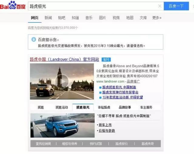 “百度提示您:路虎揽胜极光变速箱故障频发,被央视2015年3.15晚会曝光,请谨慎选购。”