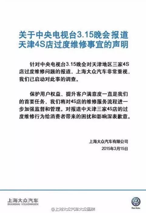 在四则公告中,上海大众的公关可能做得最有问题,尤其它限定城市了“天津”,想借此来缩小问题,强调问题的区域性,非普遍存在。