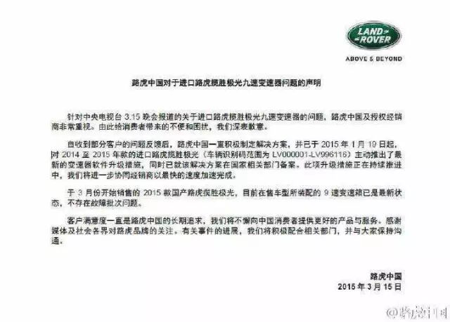但是对与路虎品牌,还是意外的考验。其实关于极光9速的问题,路虎早已提起重视,但是时机不巧,在处理过程中,被媒体取材报道了。
