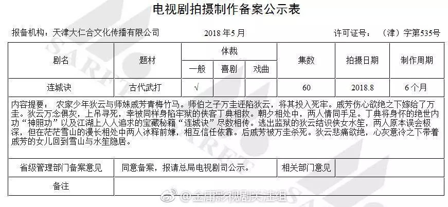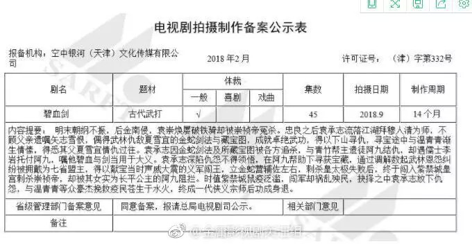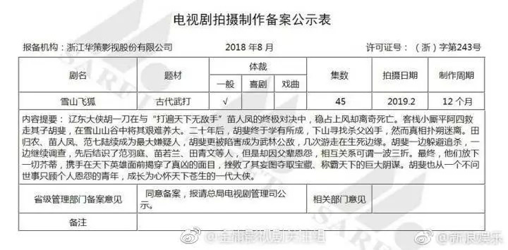 另外,根据以显示的电视剧备案表,金庸的三部相对边缘的作品《雪山飞狐》《连城诀》《碧血剑》也都备案在册,其中,《雪山飞狐》由华策出品。
