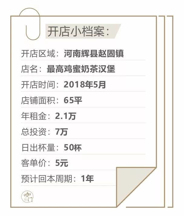 这个店能开起来,一是因为我们没有加盟,省去了大笔加盟费。水吧台是在市里农贸市场定制的,比网上1000-2000的水吧台要贵一倍,但是人家管教技术也供原料。其次是为了提升营业额,我门店里还卖汉堡、炸鸡、披萨,这些食品在农村很受欢迎,和奶茶也搭。