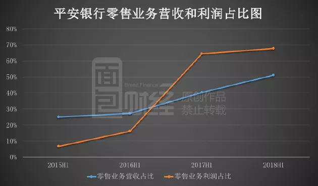 2018年上半年,零售业务占比达到51.2%,比去年同期上升近11个百分点;零售业务的利润占比为67.89%,同比上升3.4个百分点。