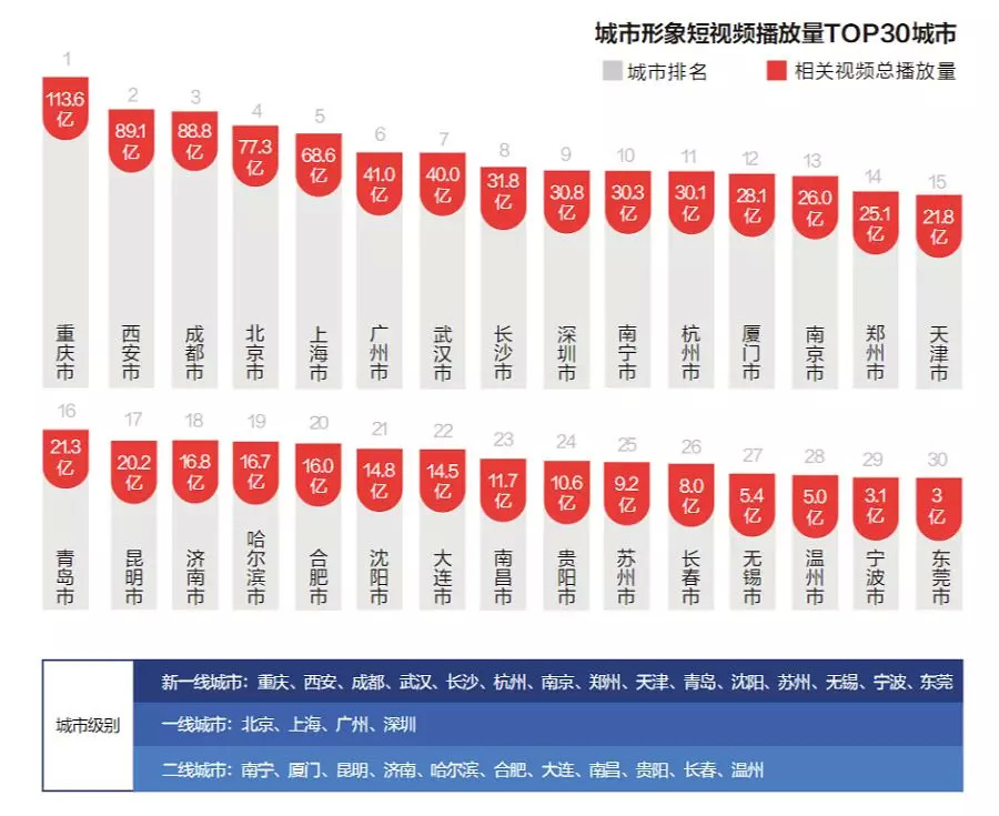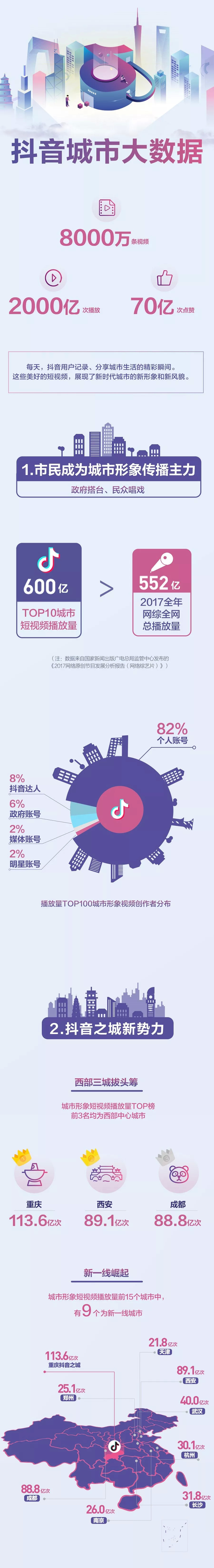 抖音数据显示,西部三城重庆、西安和成都,是目前抖音上最火的城市。它们在抖音上的火爆程度,已经超过了北上广深。这三座城市,也正是国内新一线城市的代表。其中,重庆是最受欢迎的“抖音之城”,其相关视频总播放量破百亿,替代此前最火热的西安成为新的抖音城市霸主。
