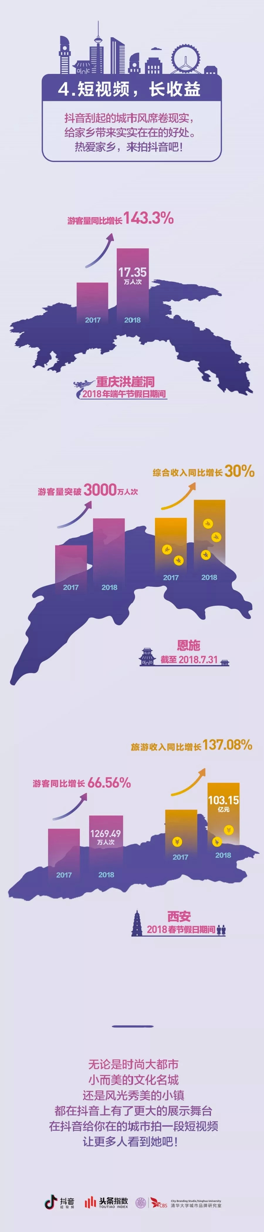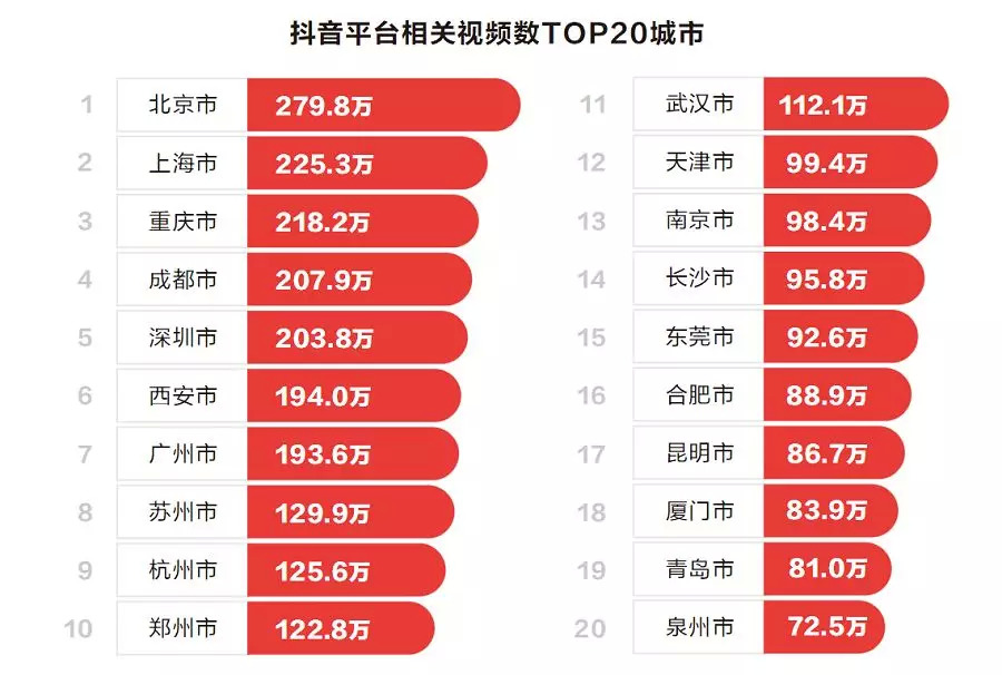 9月11日,抖音、头条指数与清华大学国家形象传播研究中心城市品牌研究室联合发布《短视频与城市形象研究白皮书》(下称《白皮书》)。这份白皮书基于369个中国内地城市、近8000万条视频内容而生成,详细展示了“抖音之城”的秘密,是抖音首次对外公布的城市大数据。