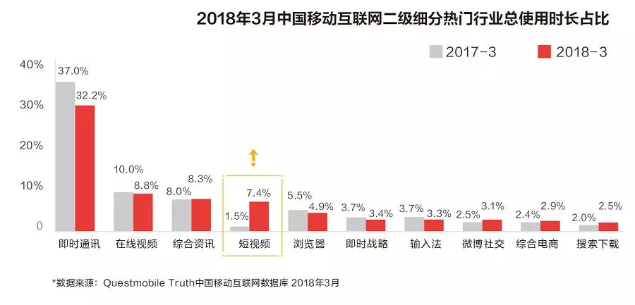 《白皮书》显示,近一年以来,短视频类产品的日活用户增长迅速,用户使用习惯快速成型。来自市场研究机构的数据显示,与去年同期相比,2018年一季度,用户的注意力向短视频类产品快速转移。