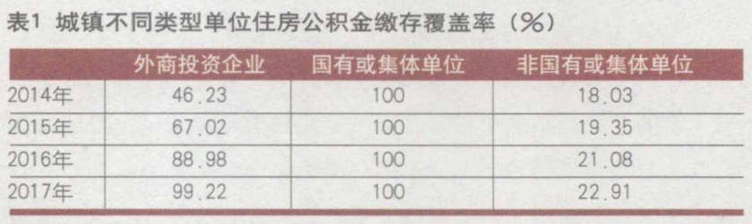 从城镇不同类型单位住房公积金缴存覆盖率的差异看,住房公积金收缴覆盖率的普惠性同样依然存在硬伤。城镇国有或集体单位缴存覆盖率早已实现了全覆盖,外商投资企业住房公积金缴存覆盖率也迅速提升,2017年接近100%。而城镇非国有或集体单位,包括城镇私营企业及其他城镇企业、事业单位、民办非企业单位、社会团体等,缴存覆盖率升幅过慢,2017年仅为22.91%。(见表1)