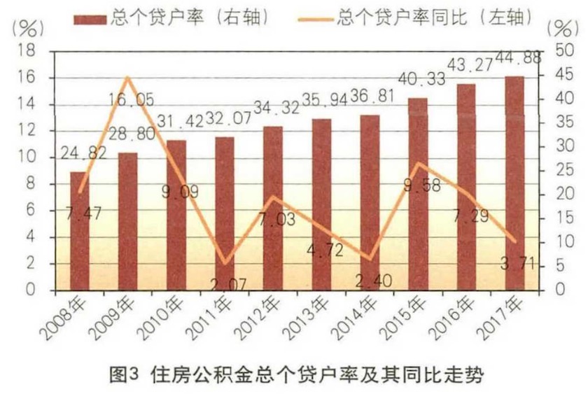 该指标反映的是住房公积金在使用环节对缴存住房公积金者的覆盖程度。住房公积金贷款户数累计总额与住房公积金缴存户数累计总额之比,即住房公积金的总个贷户率,在2015年突破四成以后连续三年持续上升,2017年升至近45%。这个比例依然意味着,约有55%缴纳了住房公积金的家庭并没有实际使用住房公积金贷款。此外,从变化趋势看,个贷户率的年度同比在2015年达到阶段性高点后连续两年下跌,2017年仅为3.71%。住房公积金使用环节的普惠程度在2015年越过40%一线后上行乏力,同比指标在2017年相对2015年下跌近6个百分点。住房公积金覆盖程度仍然较低,且近两年提升缓慢。(见图3)