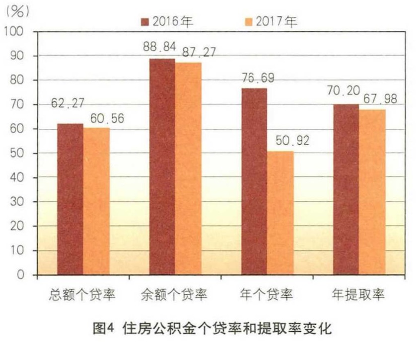 2017年,住房公积金个贷率和提取率全面走低。年个贷率下降幅度超过25个百分点,仅为50.92%,这就意味着缴存的住房公积金转化为住房公积金贷款的比例刚刚过半。(见图4)