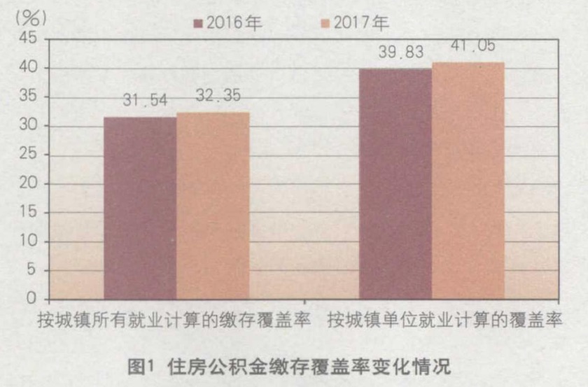 2017年,按城镇单位就业人口计算的住房公积金收缴覆盖率较2016年略有提升,达到41.05%。这是自1991年从新加坡引进住房公积金制度以来的最高值,但距过半水平依旧相差较远。目前,住房公积金在收缴环节惠及人群依然有限,近60%的单位职工没有分享到该制度的红利。若按城镇所有就业人口(城镇单位就业人员加上城镇个体就业人员)计算,其惠及范围进一步缩水超过10个百分点,近70%的城镇就业人口并没有机会参与其中。(见图1)