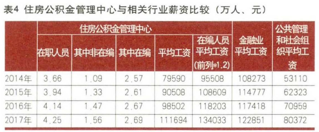 那么,在实际运行中,住房公积金管理中心究竟是一个什么性质的机构?可以量化观察的一个重要指标即在职人员平均工资收入。住房公积金管理中心在职人员特别是在编人员,年平均工资收入明显高于同类单位(公共管理和社会组织),近两年甚至超过了金融业,2017年更是高出金融业近12000元(见表4)。从工资收入看,住房公积金管理中心的机构性质更像是经营业绩颇好的金融机构而不是事业单位。
