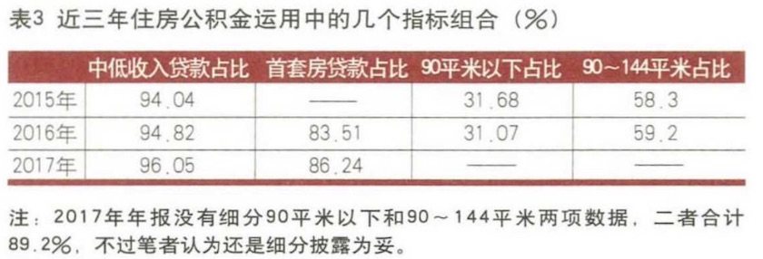 从年报披露的相关数据中,似乎可以看出一些端倪。中低收入者住房公积金贷款占比和首套房公积金贷款占比均很高,但住房公积金贷款用于90~144平米的购房比例同样也很高。如此奇怪的数据组合的确令人费解。2017年,全国城镇居民人均住房面积约为37平米,据此推估,中低收入人群的人均住房面积约为30平米,按照家均人口为3估计,家均面积约为90平米。以此对照表3中的数据组合,的确令人难以相信住房公积金贷款主要是支持了中低收入者购房和首套房需求,而与住房投机无关。