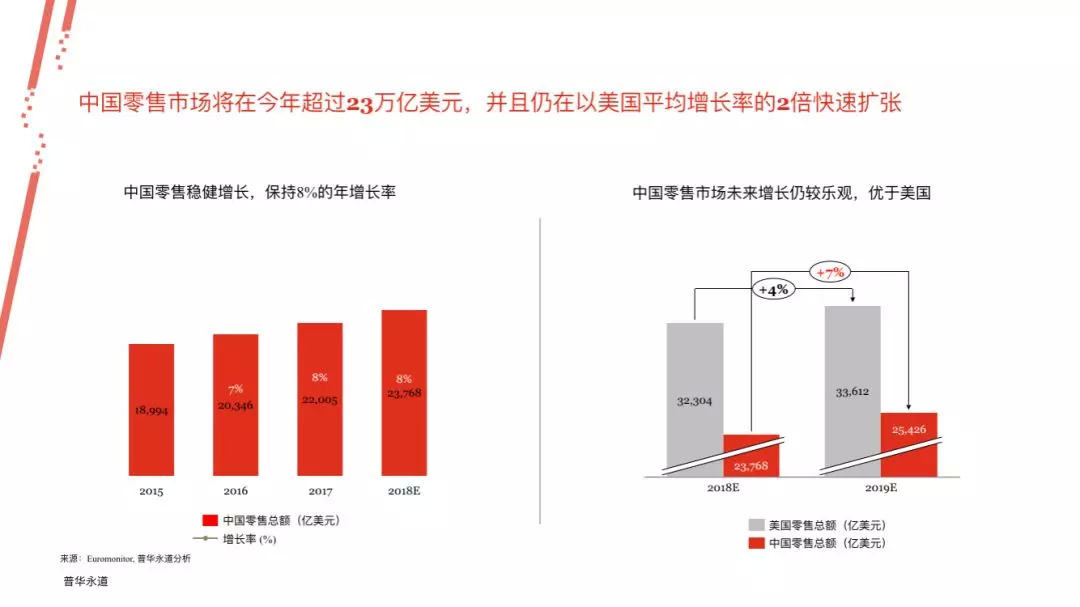 中国的消费零售业是中国经济发展的亮点,到今年为止规模超过23亿美元,过去的5年增长率年均是12%,在未来的几年我们相信增长率也是7%到9%之间的,它相当于美国的平均增长率的2倍。按照我们的预计,在未来的几年内中国总体的消费总量会超越美国,当然也随着我们整体的GDP的增长超越美国。这是一个非常非常令人振奋的信息。
