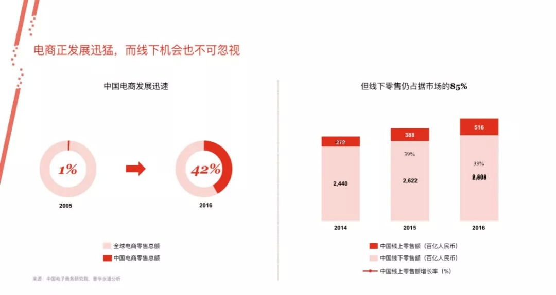 再看电商,这是全球关注的亮点,从2005年开始,电商占全球的电商1%。2016年占全球的42%,从中国不重要到中国站在全球电商的最前端,成熟国家对中国重点观望,完全赶不上中国了。