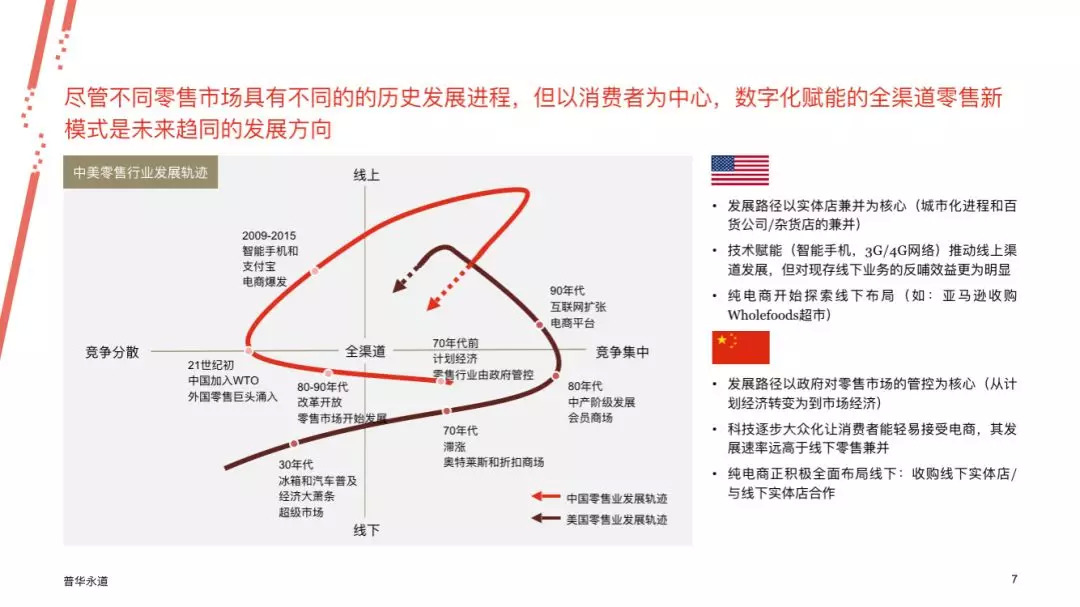 从我的角度看,我们追求的是未来零售业全渠道发展。其实美国整个消费行业从20、30年代已经开始了,当时都是很基本的东西,就是消费品,冰箱等等。70年代经济又不好,消费品出现了低价倾销,最后出现了我们见到的竞争集中。