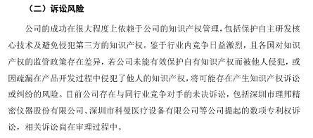 迈瑞医疗表示,若公司未来不能有效进行知识产权管理,将可能导致知识产权诉讼对公司生产经营和业务资质产品重大影响的风险,从而对公司的财务状况和经营业绩带来不利影响。