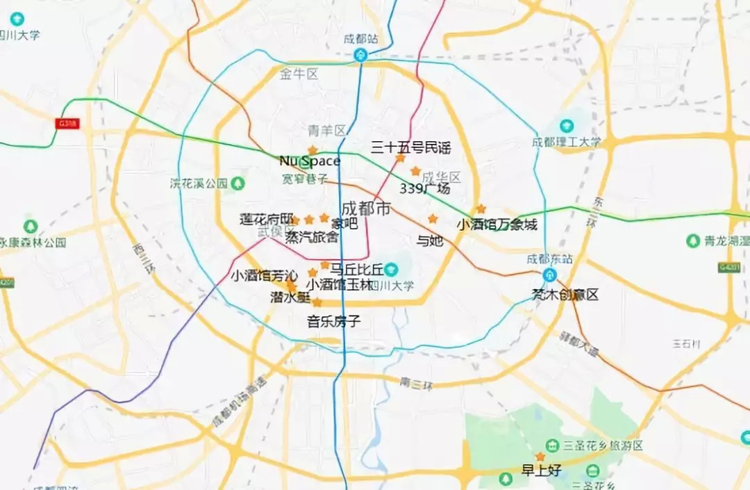 虽然在传统老成都人眼里,这边已经很远了,但是对于热爱音乐的人们,这边正是他们眼中的市中心。成龙路两侧正是乐手们的聚居地,三圣乡在成都音乐人心里正是 Woodstock 一般的存在。从小酒馆万象城店、华熙LIVE M空间、乐空间、正火艺术中心出来,都可以往这里瞧。