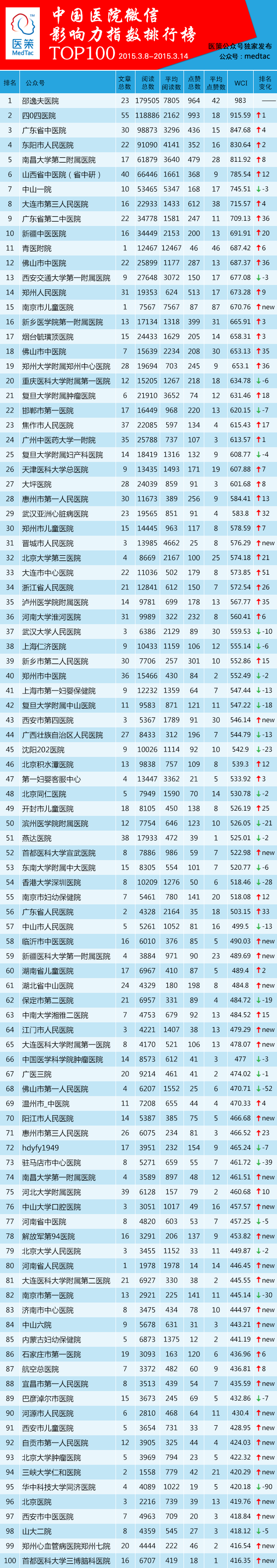苦等一周,医策君又准时带着榜单来见您了!通过对榜单的对比,医策君被中国医院微信运营团队“打鸡血”式的运营医院微信公众平台的热情给惊住了!来看数据分析: