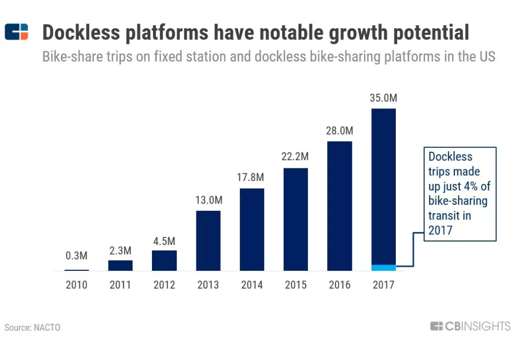 据统计,截止2017年,在总共3500万次的共享自行车出行中,仅有4%通过无码头模式进行,说明这个领域还有巨大的增长机会。