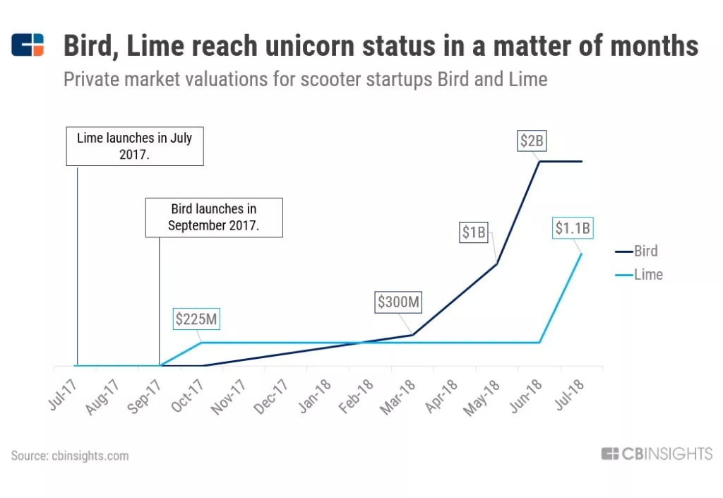 共享单车服务平台诞生在中国,在美国除了共享单车外,还衍生出了电动滑板车。不到一年,业内领先的Bird和Lime这两家公司就成长为独角兽。