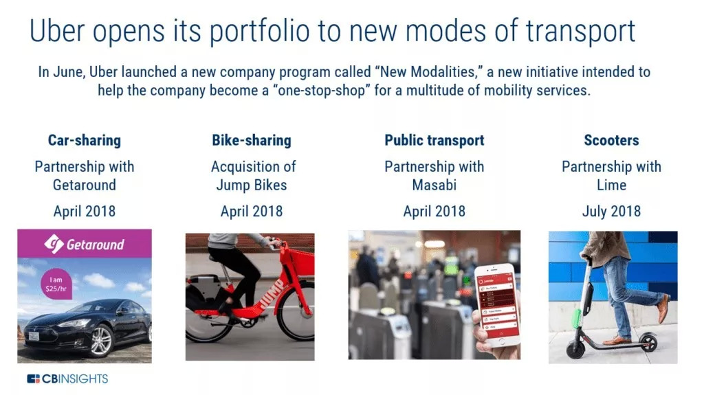 Uber在美国收购了Jump Bikes,一家电动自行车公司;参与了共享滑板车公司Lime的C轮融资,还与它共同推出共享摩托车服务。另外,它与公共交通票务平台Masabi,以及P2P汽车共享公司Getaround都有合作。