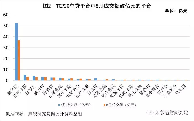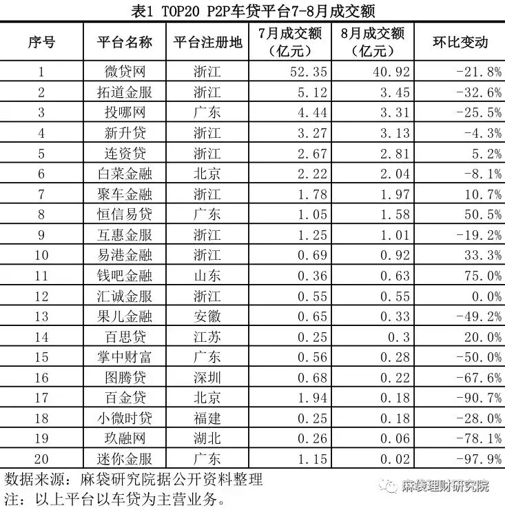 麻袋研究院统计了以车抵贷业务为主营业务的20家网贷平台,如表1所示。20家网贷平台8月份业务成交额59.94亿元,7月份成交额81.47亿元,约占当月P2P车贷行业成交额的85%,行业集中度较高。