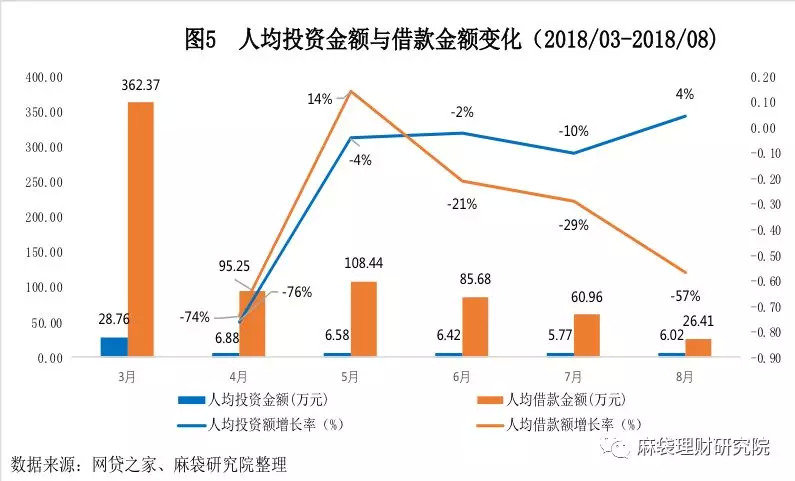 从人均投资金额(不区分个人和企业)与借款额度来看,3月份以来,车抵贷行业人均投资金额和借款金额绝对值均持续下降,但人均投资金额于8月份开始增长,表明投资人信心开始回暖。