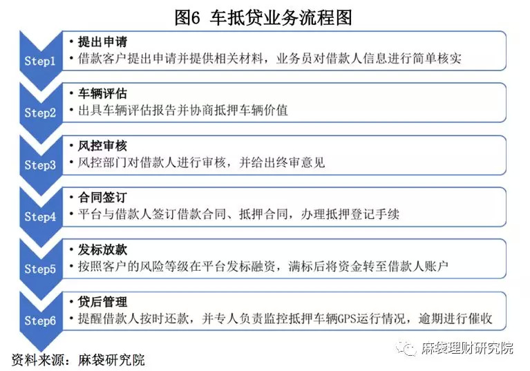 在网贷行业,车抵贷是指有资金需求的个人或企业以自购车辆为抵/质押物,通过网贷平台借款融资的业务。一般业务流程如图6所示: