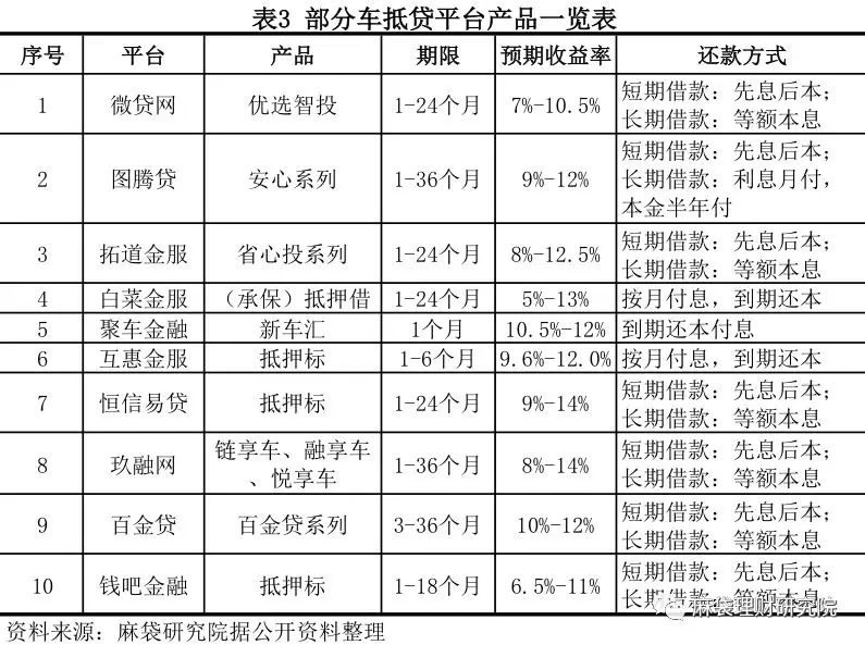 目前,纯粹从事车抵贷业务的部分平台产品如表3所示,各平台的产品除了借款期限和收益率有所差别外,产品同质化竞争严重。
