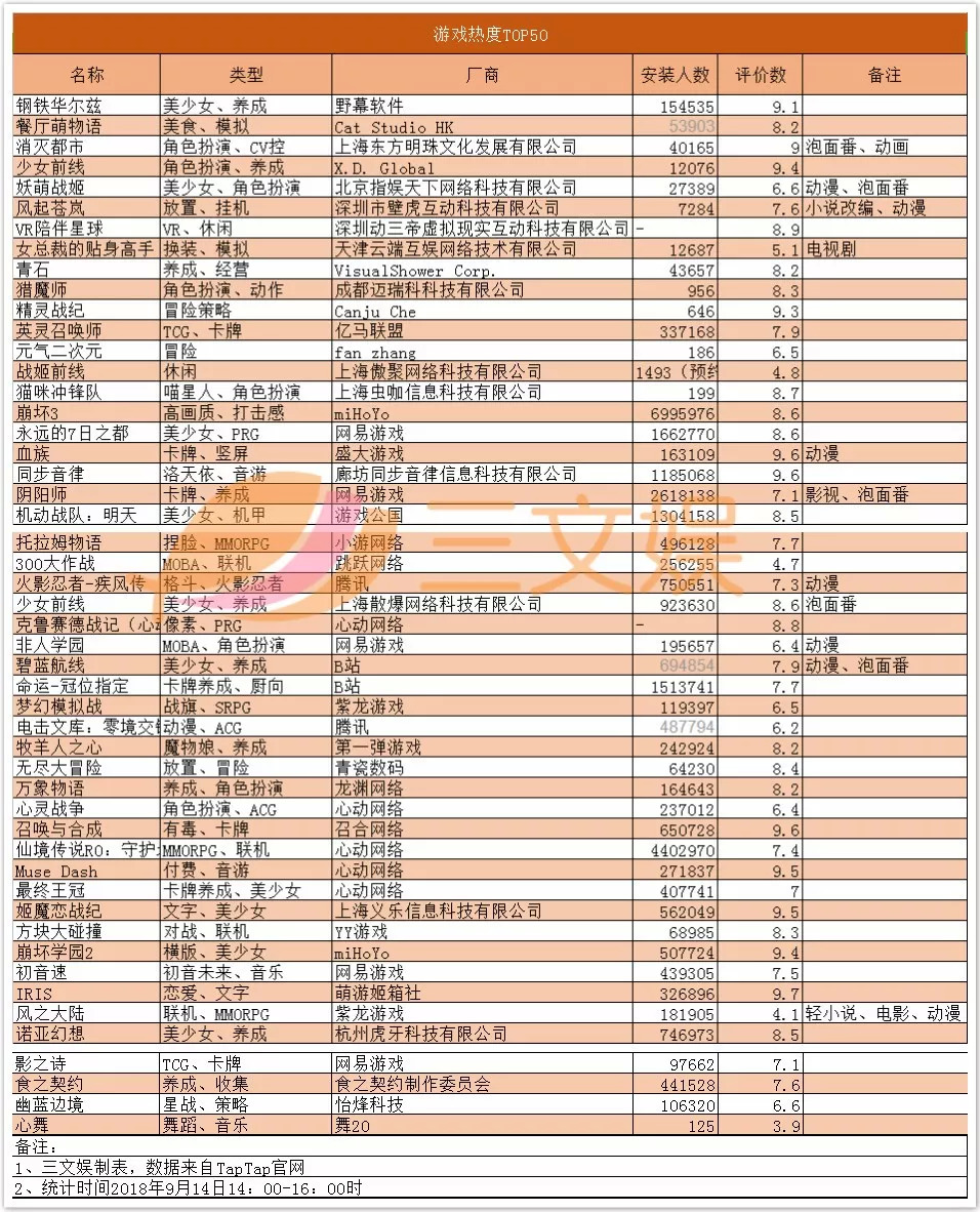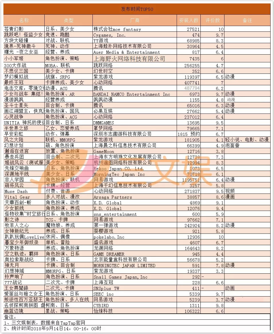 二次元游戏在国内刮起的“热潮”,也可以用一组数字来说明。2018年1月4日,三文娱在TapTap以“二次元”为标签检索,半年内上线的二次元游戏数量为600(600为搜索最大值),9月14日再检索时发现,相关的二次元产品数量为5883款。而TapTap,是在2016年7月开始运营。