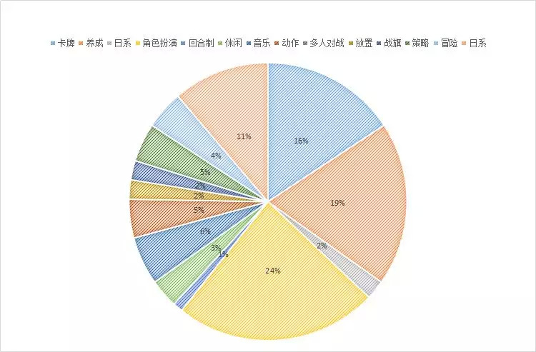 在三文娱统计的近100款(考虑去重)二次元游戏中,“卡牌+”的二次元游戏产品占比仅有16%,而仅侧重于角色扮演、日系和养成的产品占比,就达到了44%。