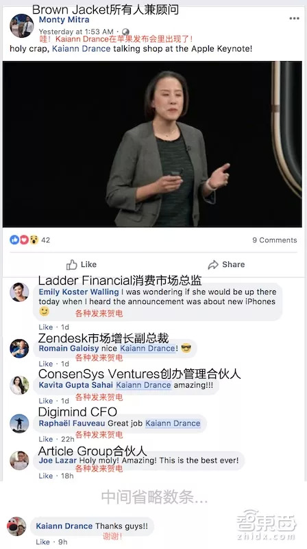顺便一提,这位苹果女高管Kaiann Drance在媒体跟同行当中人缘颇好,这是她第一次在苹果秋季新品发布会上登台演讲,下场之后同行跟加州大学伯克利商学院的老同学们纷纷“发来贺电”。