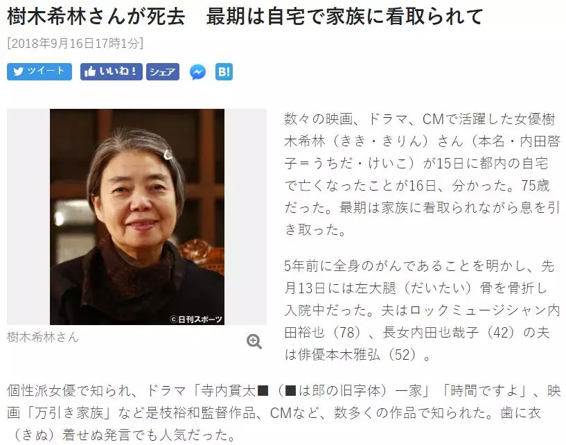 据日媒报道,日本资深演技派女星、是枝裕和御用女演员树木希林于9月15日去世,得年75岁。树木希林5年前曾被诊断全身多处患癌,但从未放弃演出。