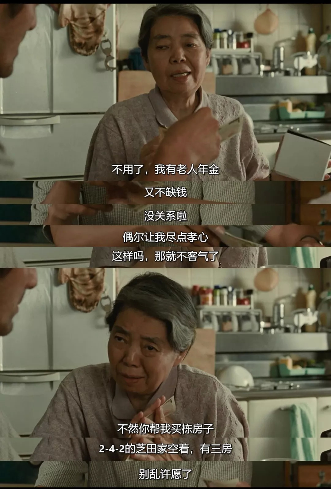 当“废柴”儿子“阿部宽”给她零花钱时,心知这个儿子生活困窘,先是百般推辞,后面接受之后,转头就说“不然你帮我买栋房子吧”。
