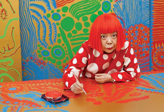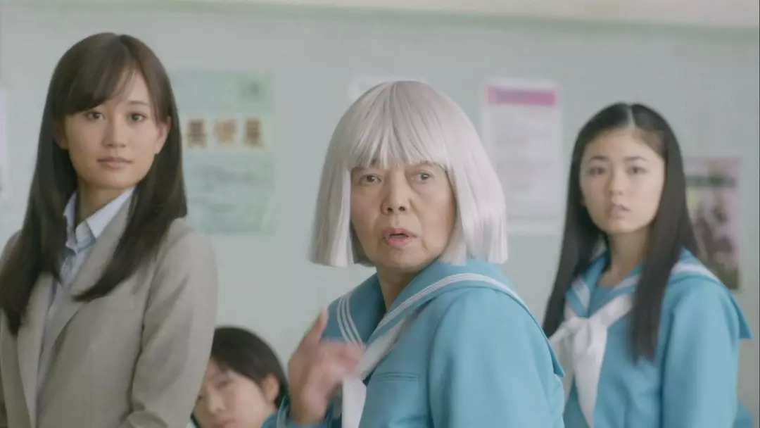 搞怪的树木希林在日本SoftBank广告里,装扮成了一位头顶白发的学生,这造型,是不是很像草间弥生?
