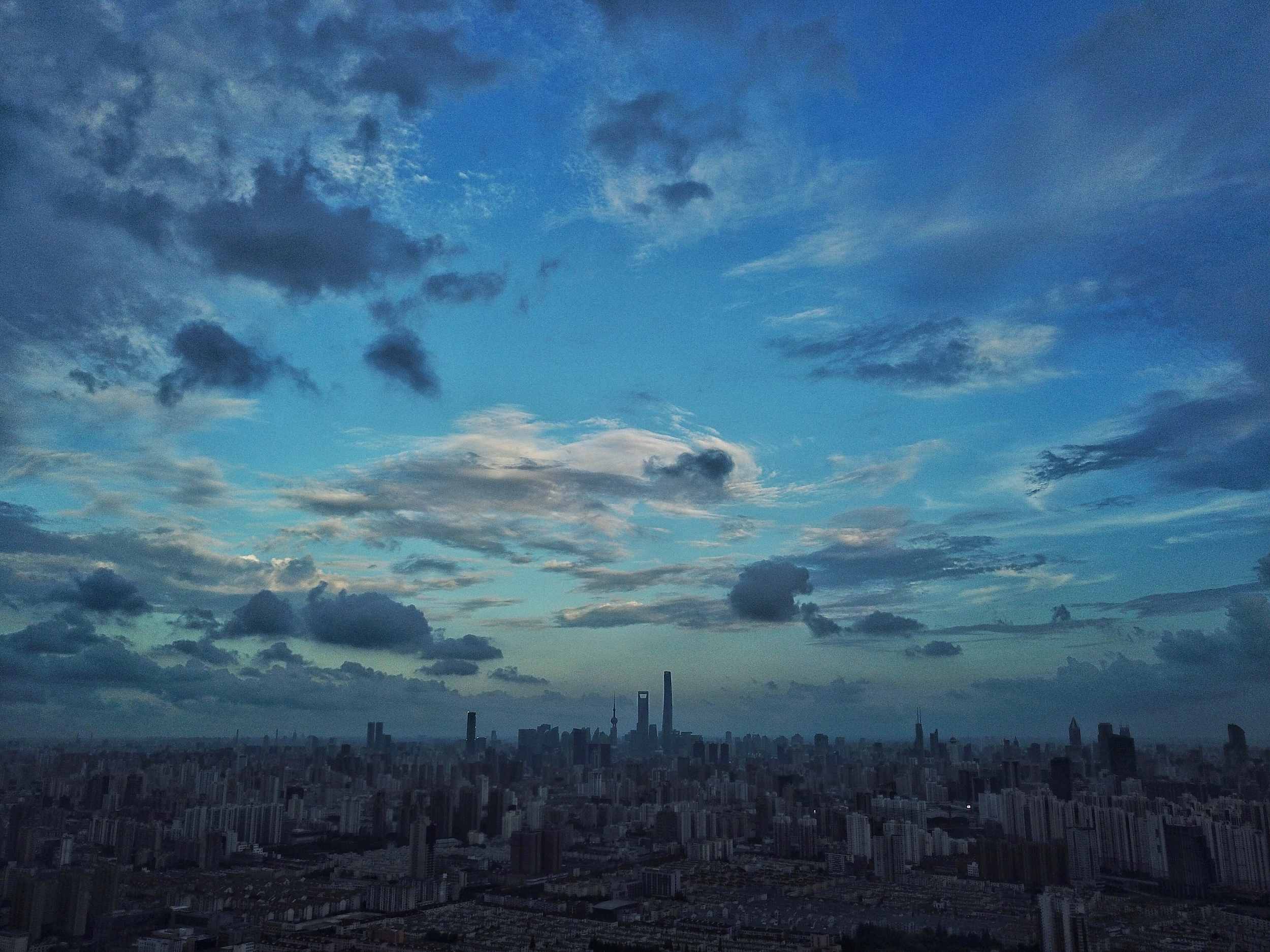 2018年9月16日傍晚,上海上空云层较厚,受台风“山竹”倒槽影响,即将迎来阵雨或雷雨。