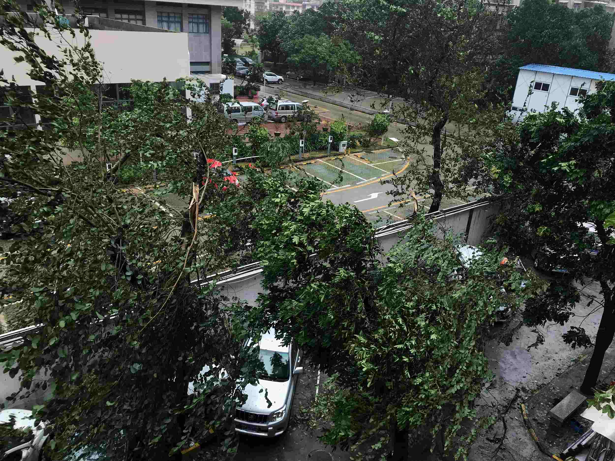2018年9月16日,受台风“山竹”影响,深圳市遭遇狂风暴雨袭击。图为深圳市罗湖区太安路粤海新村,大量树木被台风吹折。